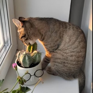 Кошка Буся любит есть цветы и даже кактусы)
